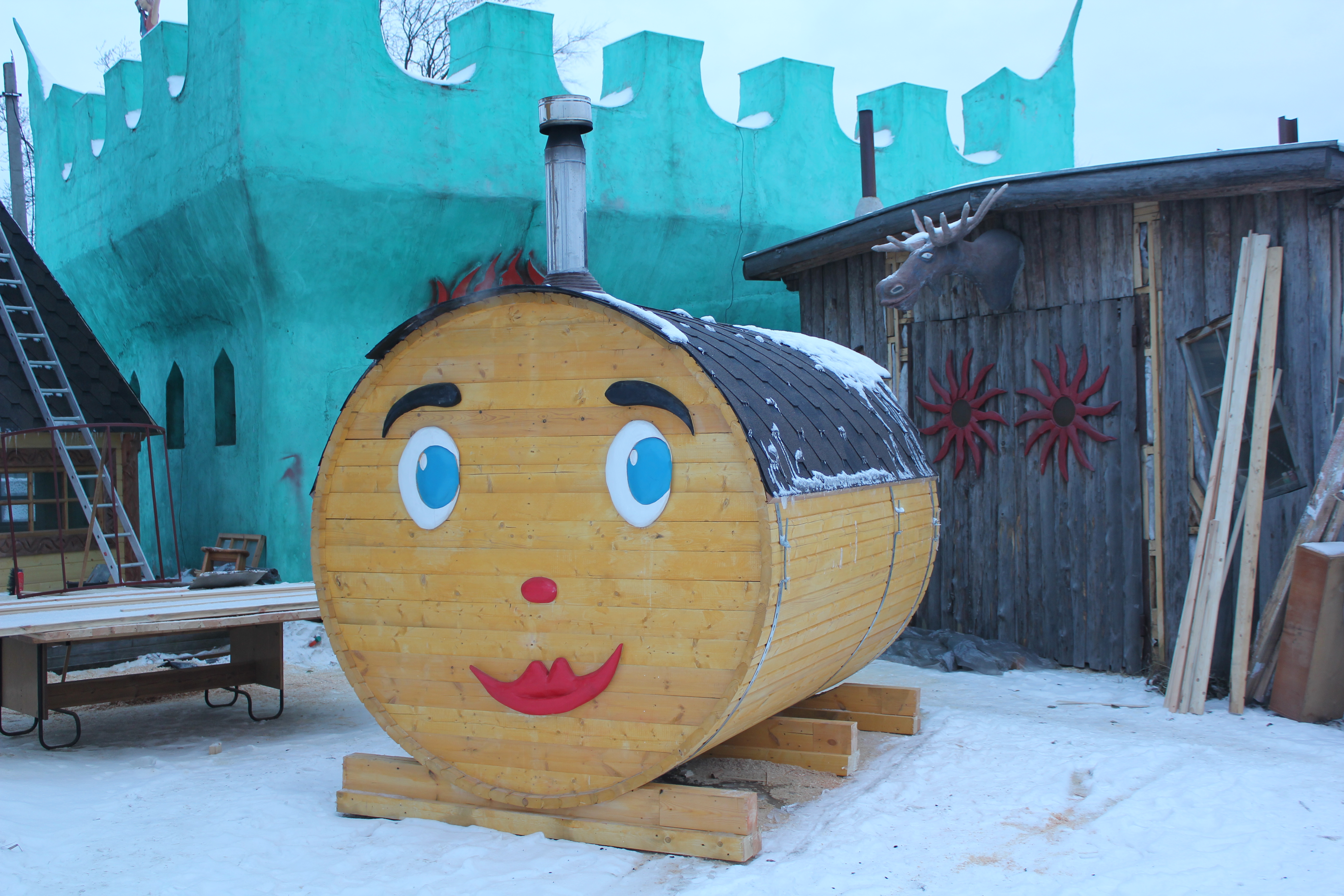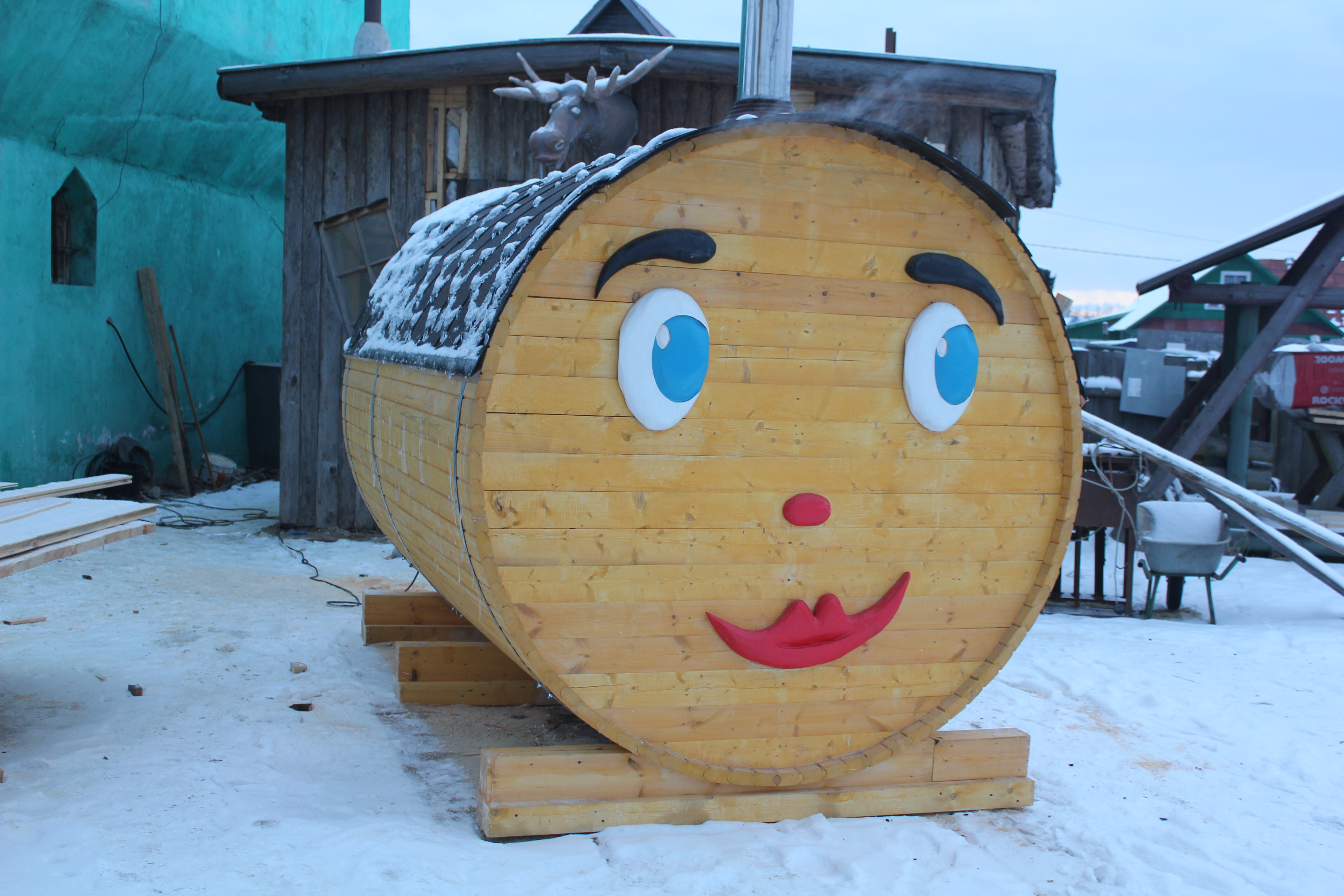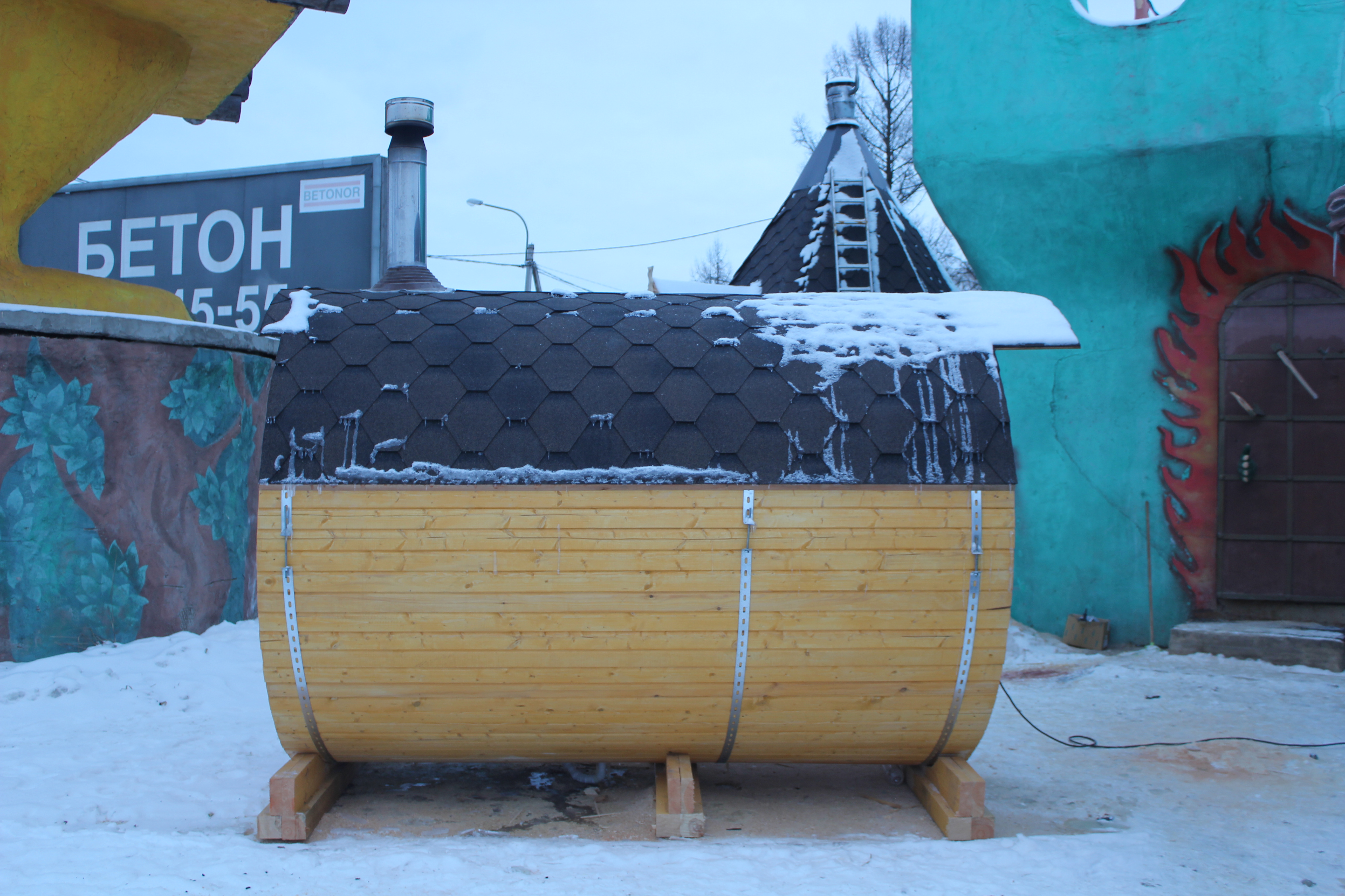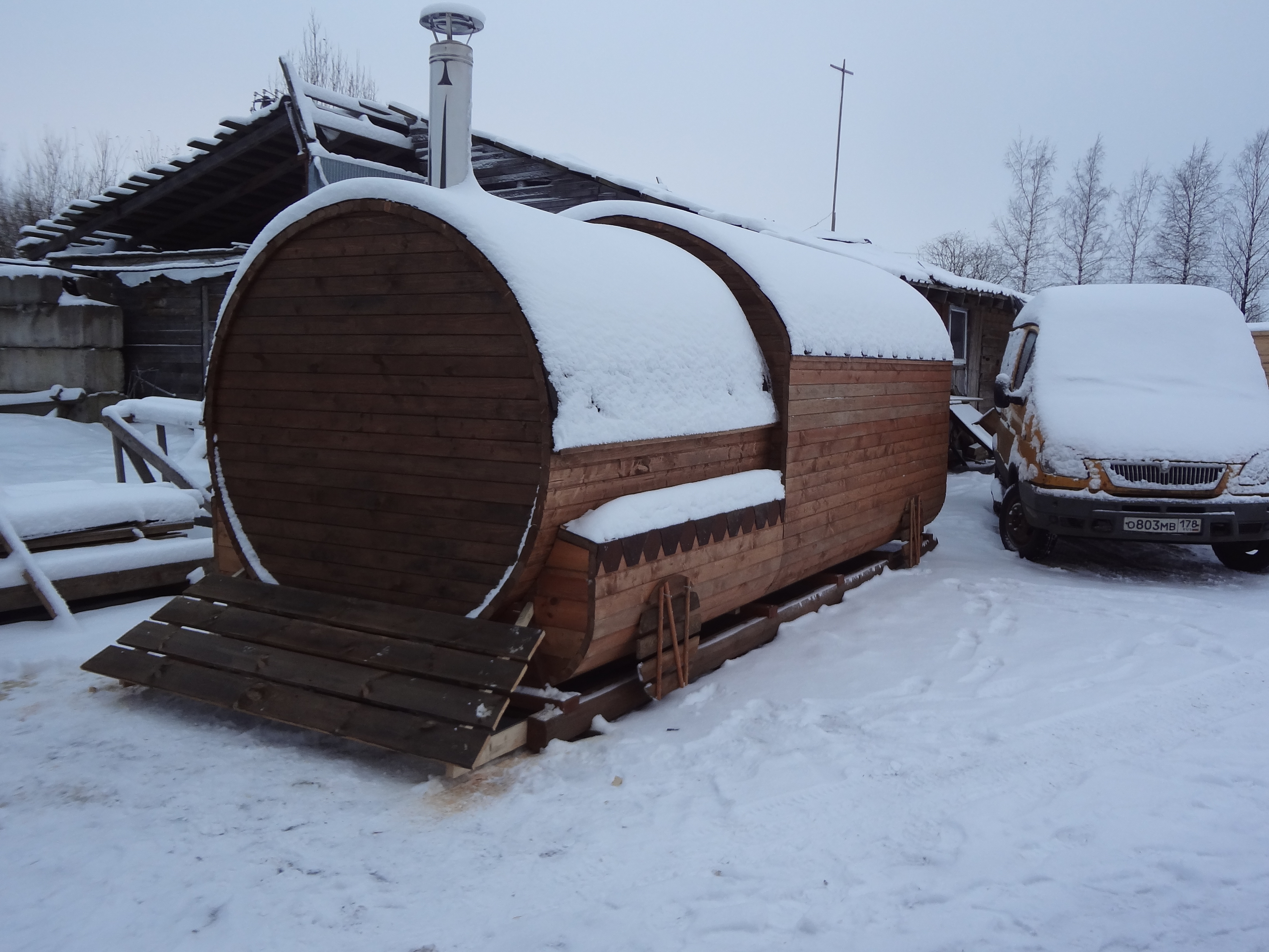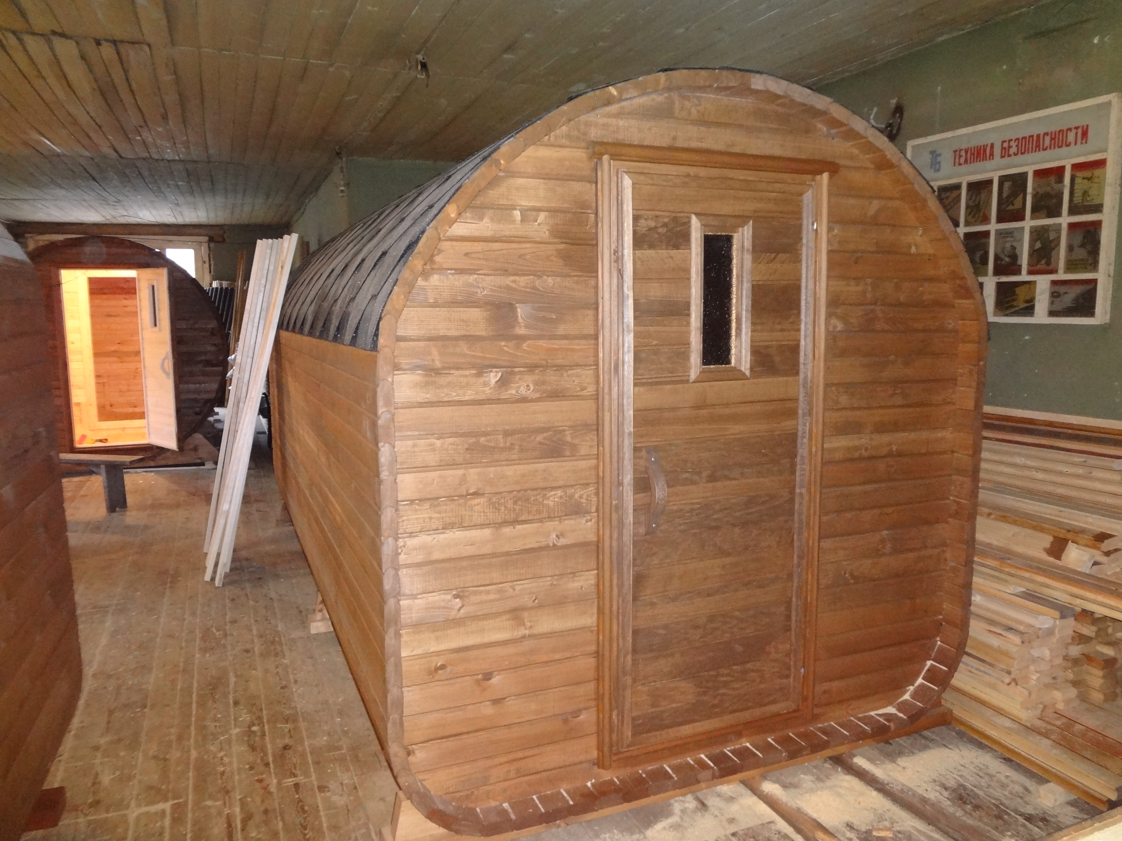 Вы можете проверить баню-бочку прямо на территории нашего производства рядом с СПб.