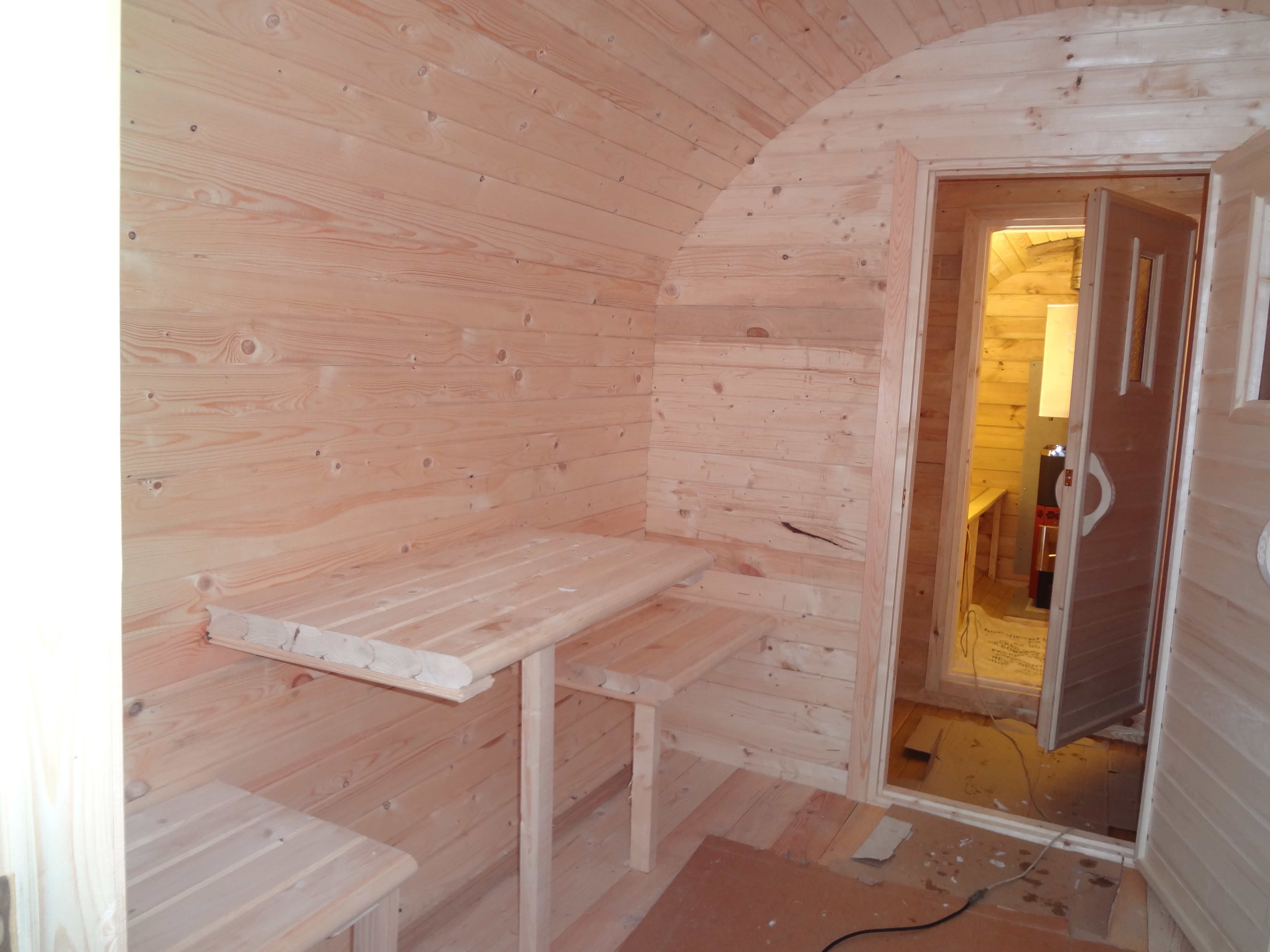 Благодря малым размерам, баня прогревается очень быстро. Не нужно топить целый день.